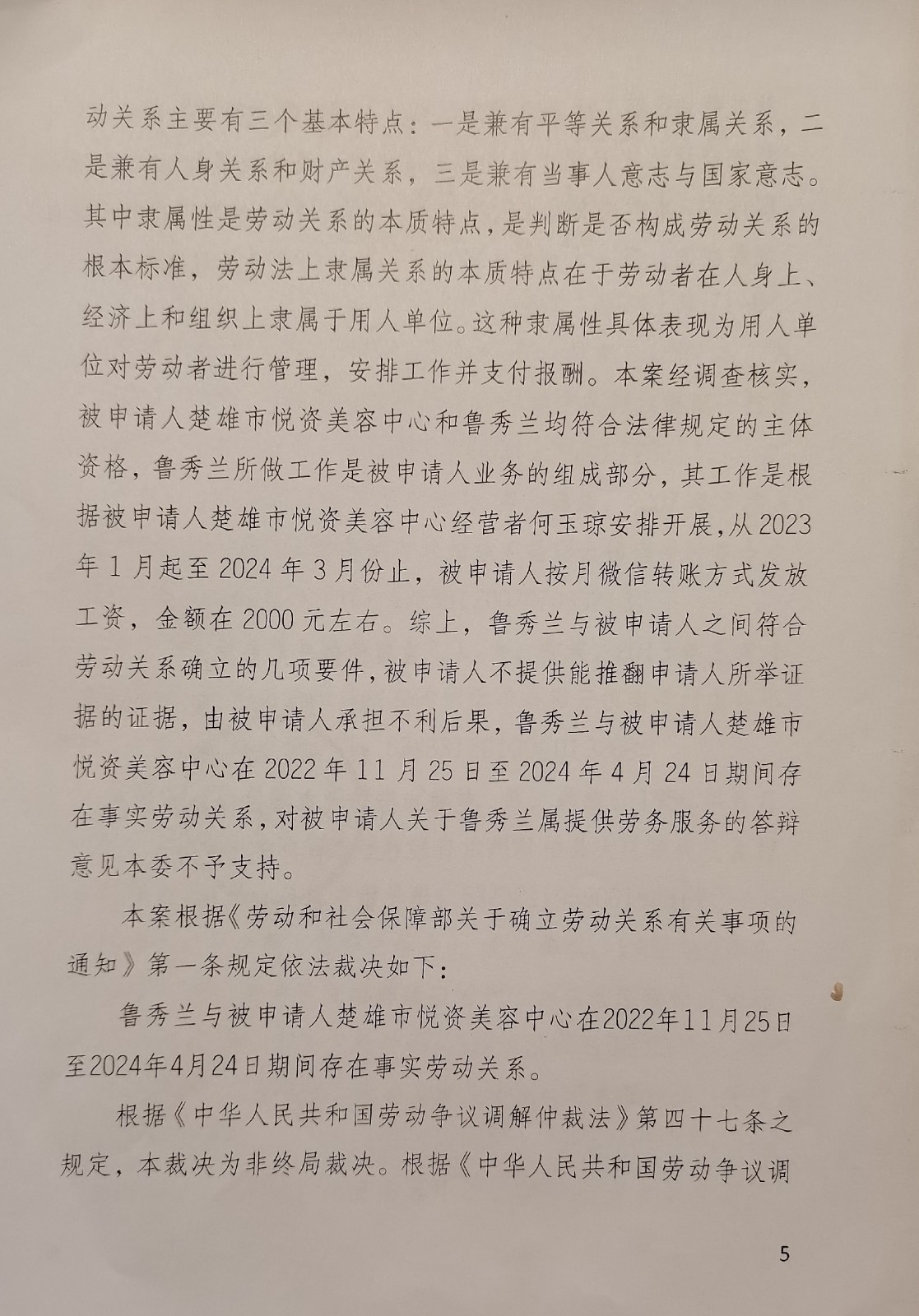 图说:楚雄市劳动人事争议仲裁认定为:存在事实劳动关系 劳动关系获得确认后,毕光平随后向楚雄市人力资源和社会保障局申请对鲁秀兰给予工伤认定。2024年12月2日,楚雄市人力资源和社会保障局作出编号:532301202400172《不予认定工伤决定书》。毕光平不服决定申请行政复议,2025年3月21日,楚雄市人民政府行政复议决定:维持楚雄市人力资源和社会保障局2024年12月2日作出的《不予认定工伤决定书》。